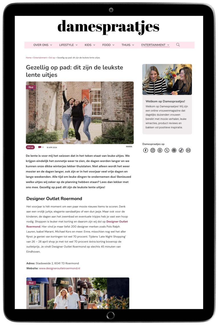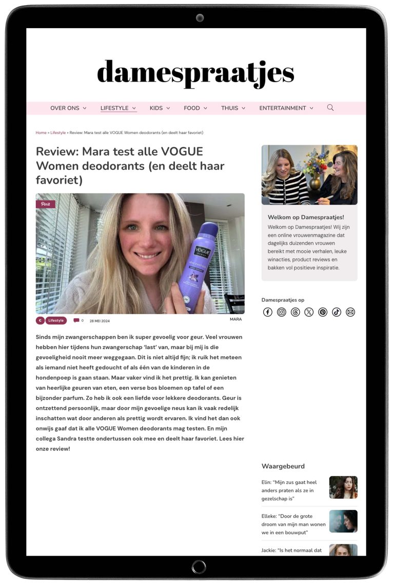 Damespraatjes.nl is een online vrouwenmagazine, die vrouwen dagelijks inspireert op positieve wijze. Damespraatjes.nl schrijft artikelen op het gebied van mode, reizen, uitgaan, seksualiteit, gezondheid, kids, beauty en nog veel meer. Daarnaast vind je er regelmatig winacties en handige product reviews.