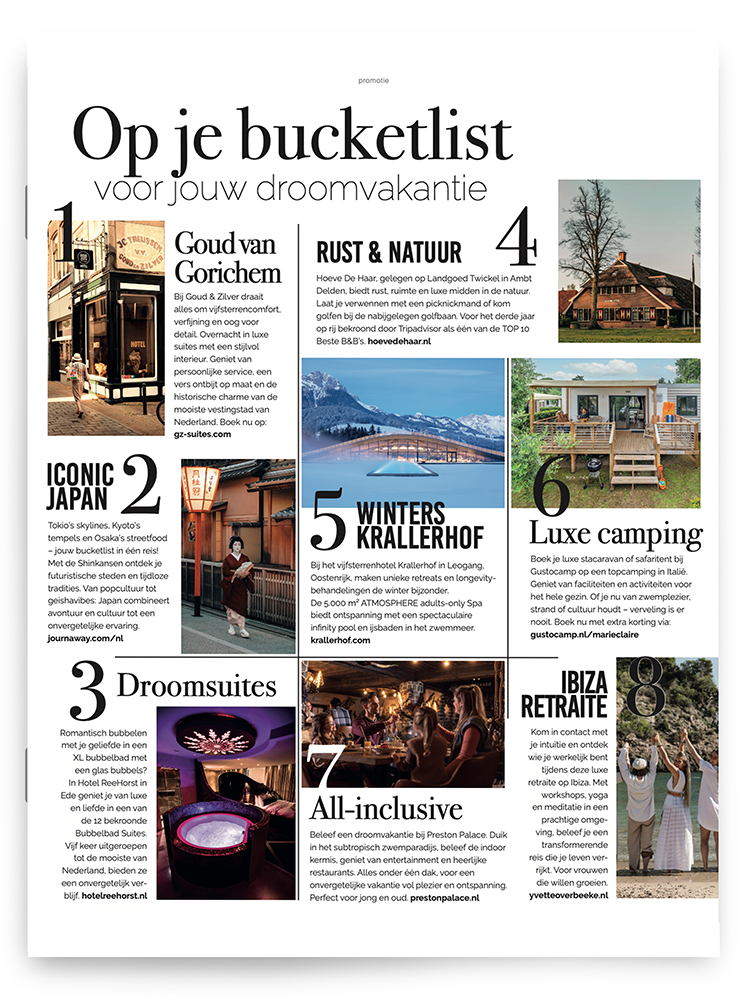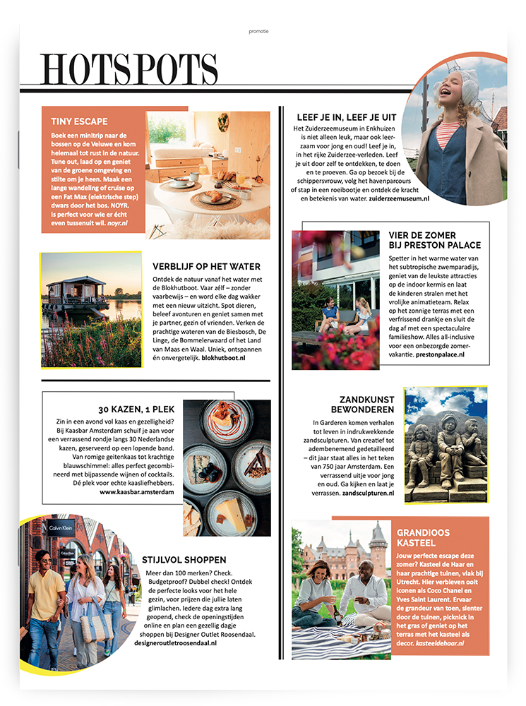 - Themapagina’s in Fabulous Mama, Flair, &C, Saar Magazine, JAN, Marie Claire, Vriendin, Plus, Kek Mama, 100% NL Magazine.